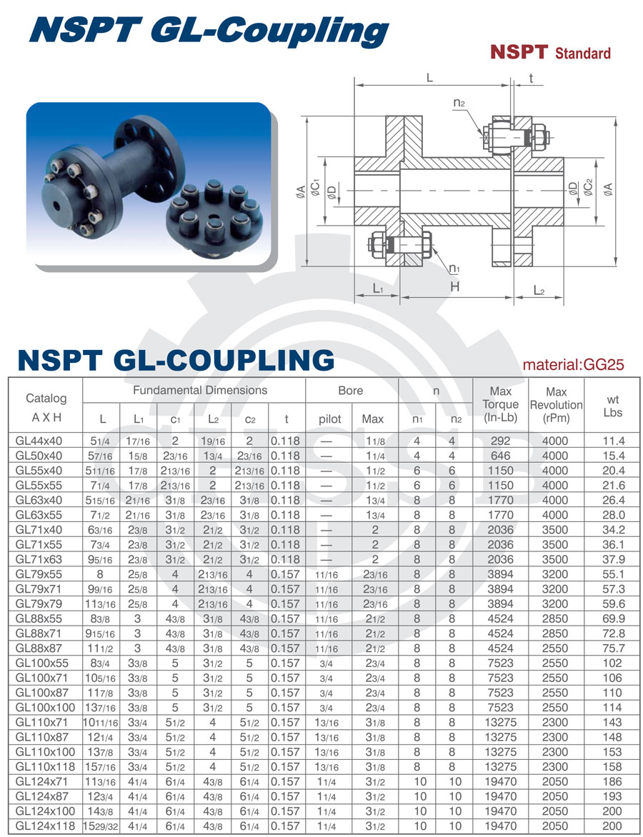 產品范圍: 美標/歐標:(GL44-GL124) 英制尺寸產品(適用于美標市場) 公制尺寸產品(適用于歐標市場) GL型聯軸器