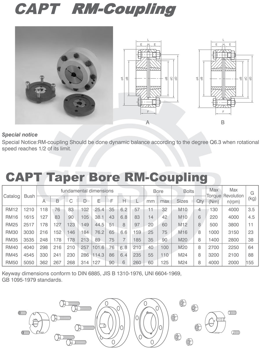 產(chǎn)品范圍: 美標(biāo)/歐標(biāo):(RM) 英制尺寸產(chǎn)品(適用于美標(biāo)市場(chǎng)) 公制尺寸產(chǎn)品(適用于歐標(biāo)市場(chǎng)) RM型聯(lián)軸器